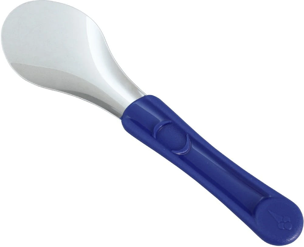 Eisspachtel aus Edelstahl mit farbigem Griff aus Kunststoff.