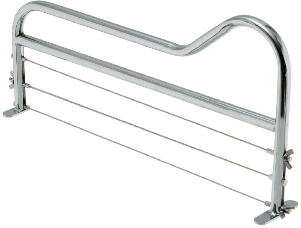 Tortenbodensäge ++ Rahmen aus lackiertem Stahl ++ Zwei Sägeblätter aus Edelstahl ++ Messer in der Höhe verstellbar (max. Abstand 50 mm) ++ Länge außen: 590 mm; Länge innen: 560 mm; Höhe: 165 mm ++