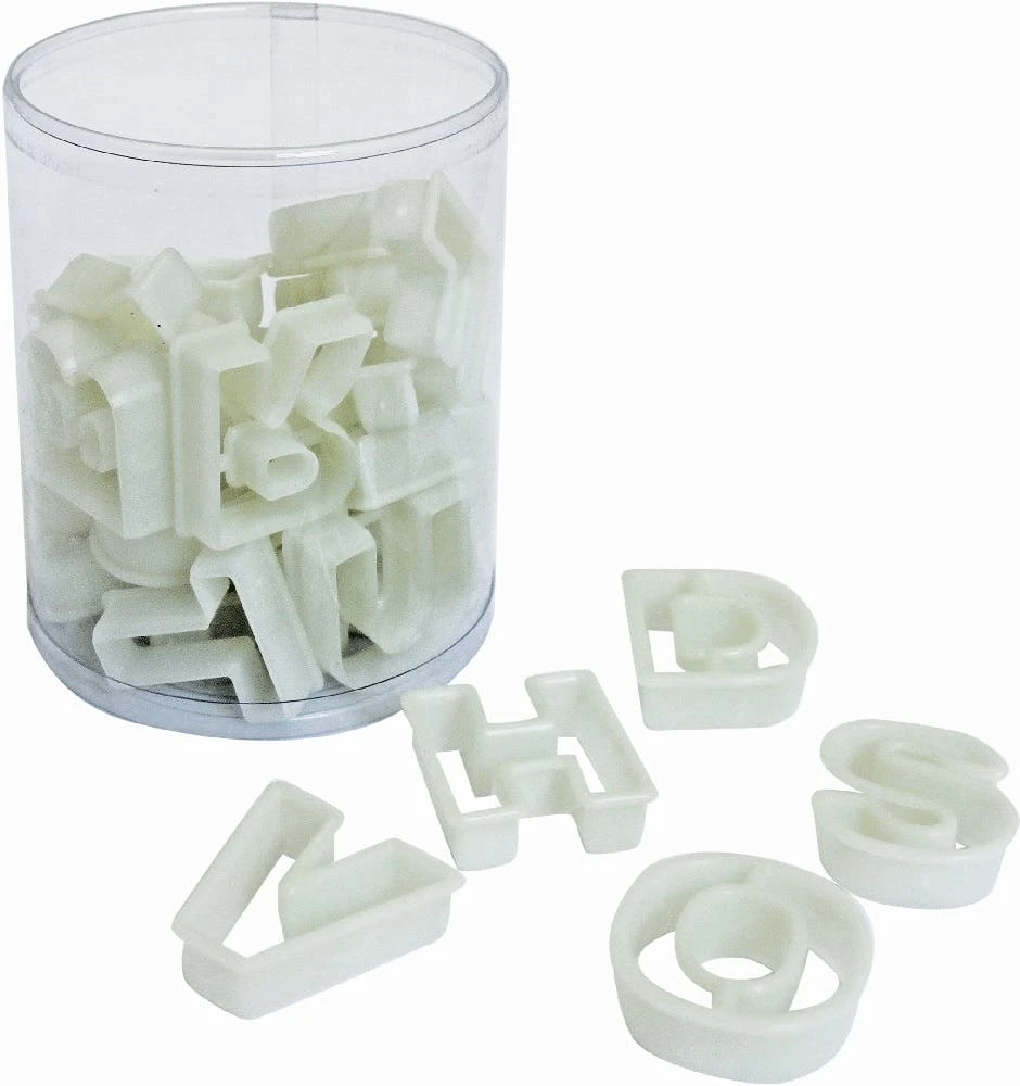 2x Ausstechformen Buchstaben aus Weißblech, 26 Buchstaben komplett in der Dose (Ø 12,5 cm) Länge: 25 mm, Höhe: 20 mm