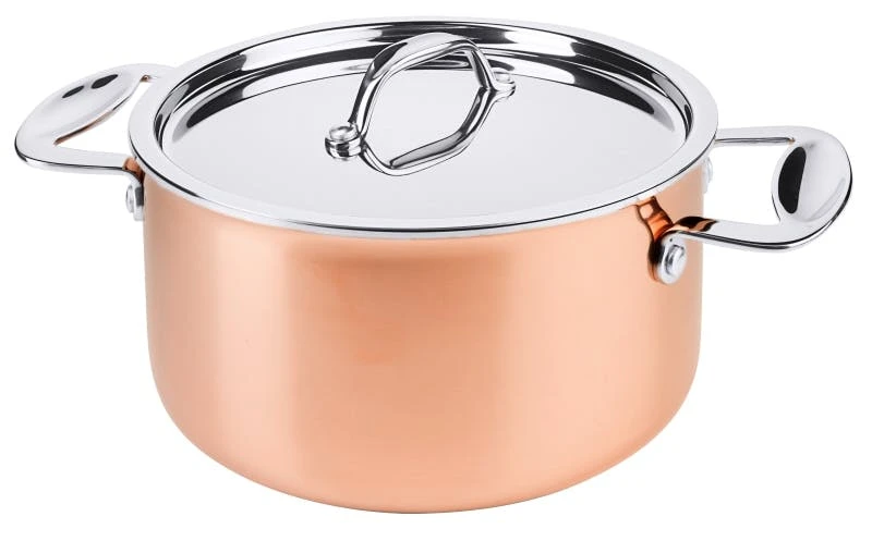 Kupfer-Kochtopf, mit Deckel, 2,5 mm starker Mehrschichtenaufbau aus Edelstahl 18/10, Aluminium und Kupfer, induktionsgeeignet, mit Schüttrand, mit genieteten Griffen aus Edelstahl