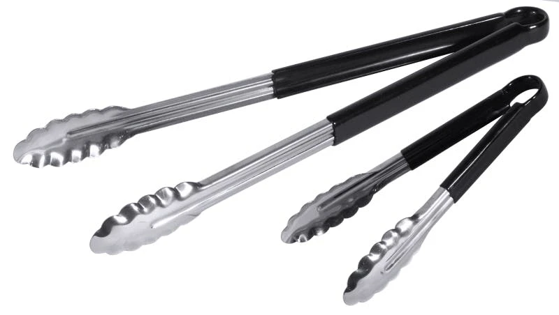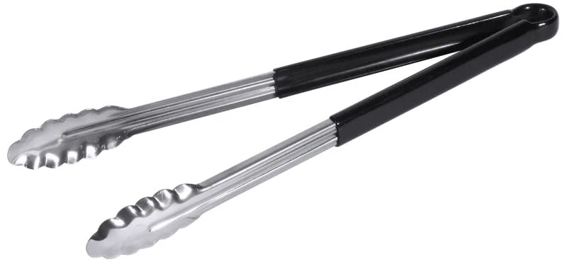 Küchenzange, aus Edelstahl, mit schwarzem Vinyl-ummantelten Griff, mittelschwere Qualität