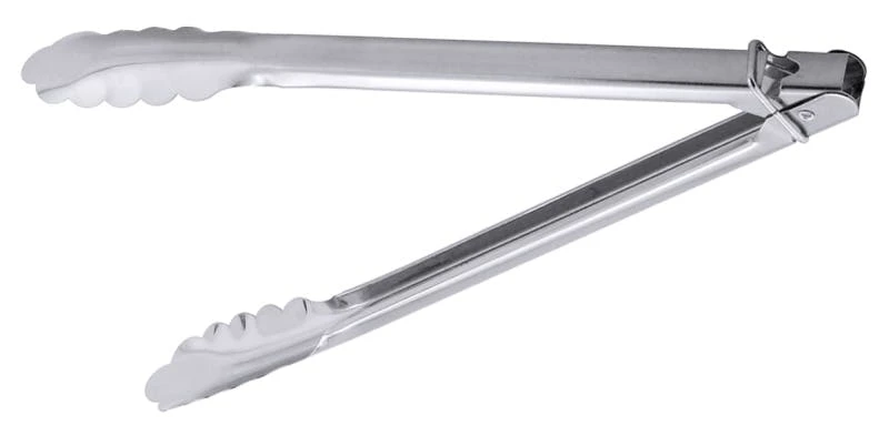 Küchenzange, aus 0,9 mm starkem Edelstahl 18/10, seidenmatt gebürstet, mit Feder und kunststoffummanteltem Zugverschluss, mittelschwere Qualität
