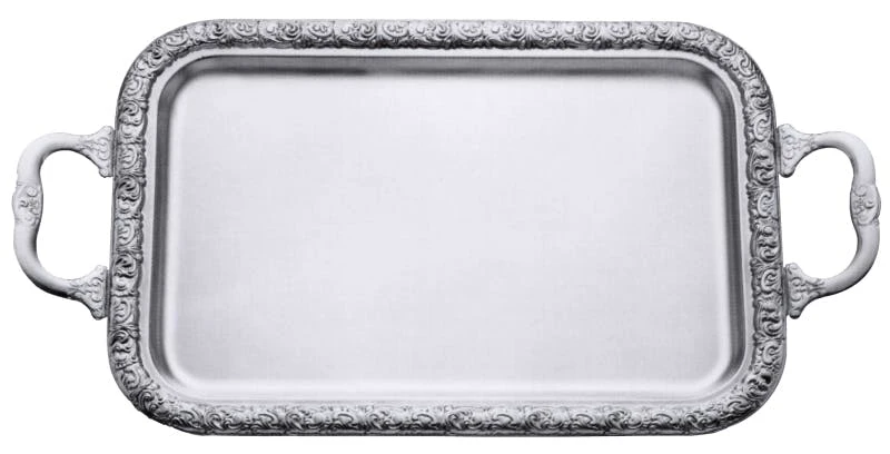 Tablett, mit Griffen, rechteckig, aus Edelstahl 18/10, mit verziertem, hochglänzendem Rand, Bodenfläche seidenmatt, schwere Qualität