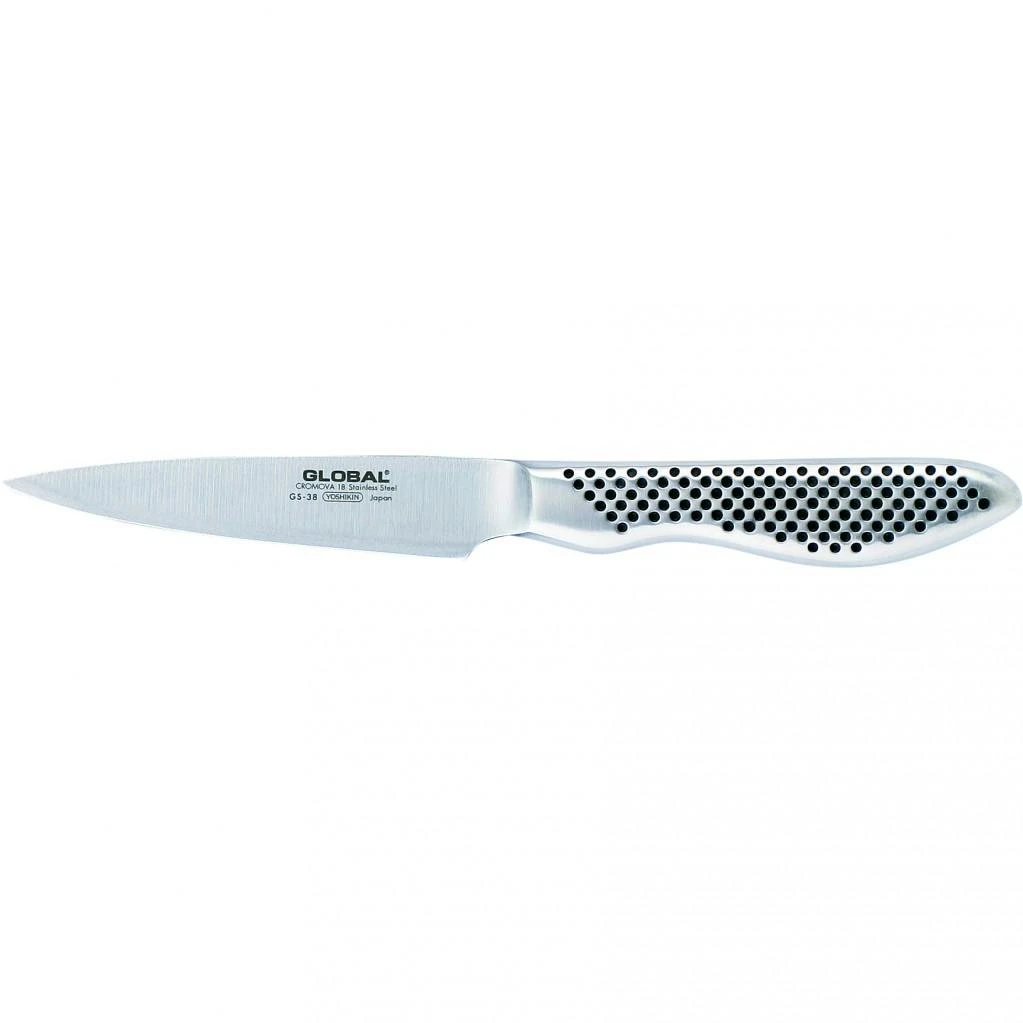 Das GS-35 Global Yoshikin Kleines Santokumesser ist ein kleines Putzmessser mit einer 13 cm langen Klinge in Santokuform. Das GS-38 Global Yoshikin Schälmesser liegt mit seinem geschwungenem Griff sehr gut in der Hand. Der Griff ist auch etwas länger als die Griffe der vergelichbaren Global Yoshikin Messer. Es ist dadurch ein richtiger Handschmeichler. Die Klingenlänge von 9 cm macht es zum idealen Schälmesser.