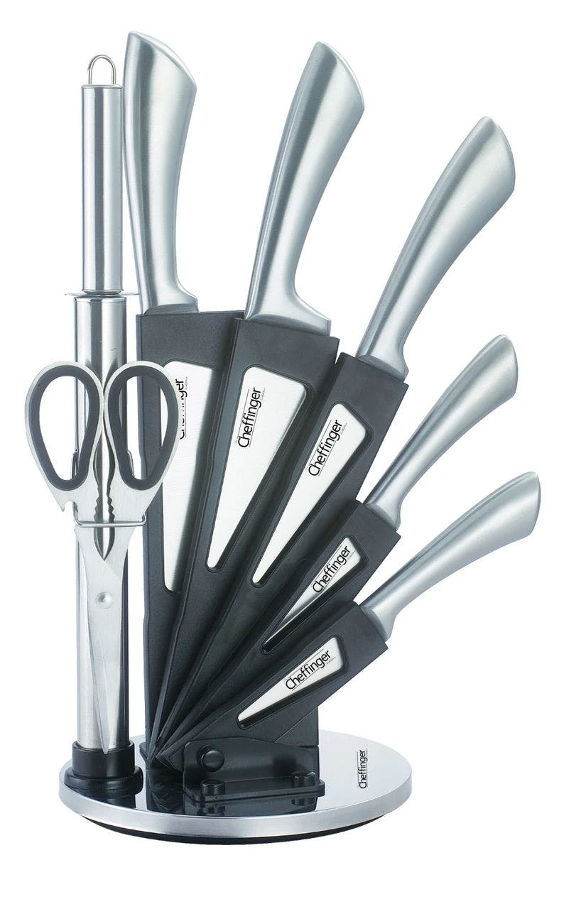 1 x Messerblock, 1 x Edelstahlfuß, 1 x Schrauben, mehrsprachige Bedienungsanleitung