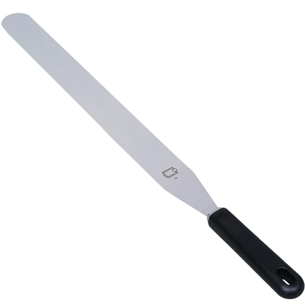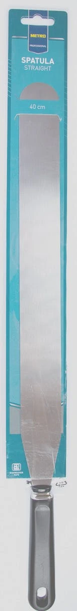 Die silberne Palette von METRO Professional hat eine Gesamtlänge von 52.2 cm.Die Palette besitz einen ergonomischen Griff mit einer flexiblen Klinge. Die Klinge hat glatte Kanten, ist aus Edelstahl gefertigt mit einer Länge von 40 cm und einer Stärke von 1 mm.
