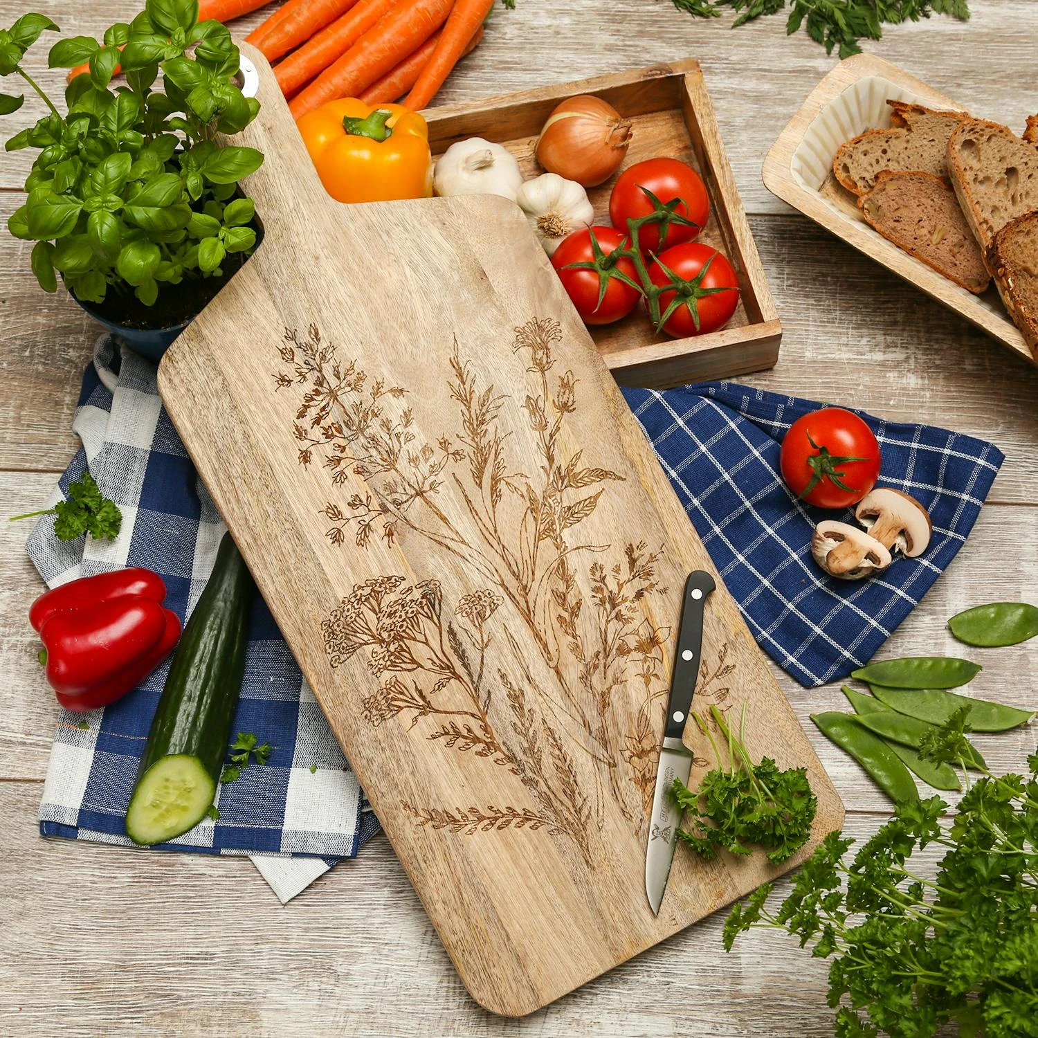 Schneidebrett – Servierbrett – Mangoholz – Kordel – L: 58cm – Wildblumenmotiv – natur