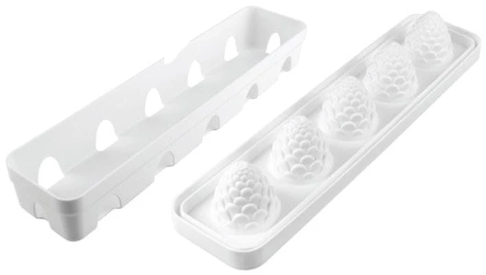 Entdecken Sie die Linie 3D Fruits! Sogar die Wälder bergen kostbare Schätze: die Tannenzapfen. Eine neue Interpretation der Welt der Desserts durch eine Form, die eine Rückkehr zu den Ursprüngen, zur Natur, zur Wiederentdeckung harmonischer und perfekter Aromen darstellt. Eine Kunststoffbasis dient als Unterstützung für eine Silikonform mit 5 Kavitäten, in der Sie die 3D-Produkte erstellen können.