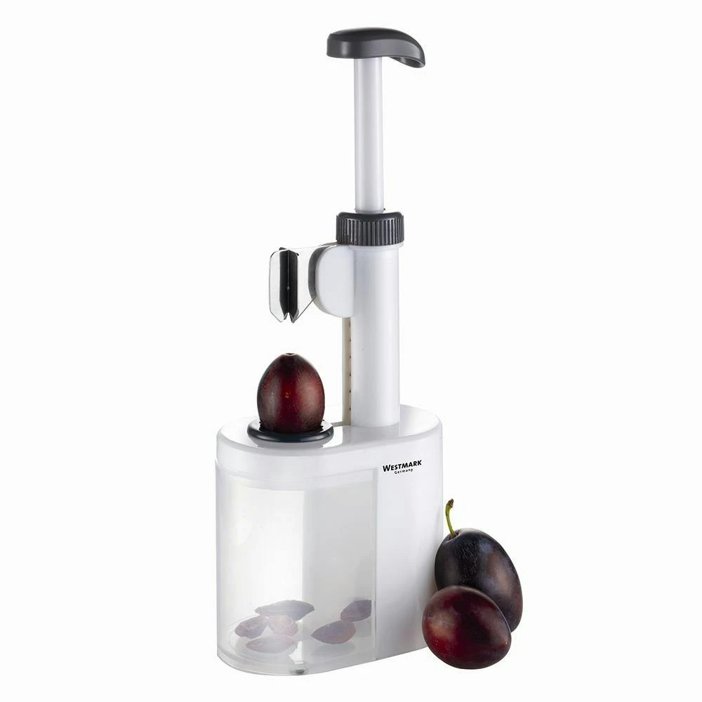 WESTMARK Pflaumenentsteiner „Prunus“ entsteint Pflaumen kuchen- und konservengerecht auch für konservierte und tiefgefrorene Früchte mit praktischem Auffangbehälter für die Steine Material: Kunststoff weiß Messer aus rostfreiem Edelstahl
